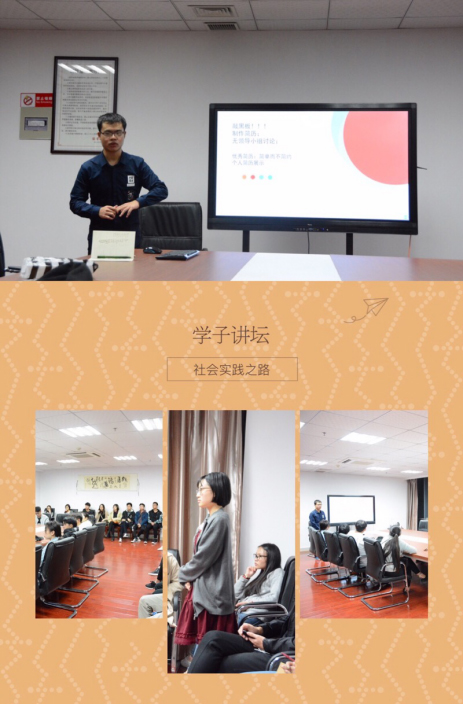 学子讲坛的初衷是“大学生应该用自己的视角发现故事,讲述故事,心系校园、胸怀社会”,以广大学生学习生活中的独特见解以及创新观点为线索,让学生在思考的同时,登上讲台,讲述身边事,主题大至大学生关心的经济,政治,文化,生态等社会热点问题,小至分享学习心得、生活感悟等身边小事,一般由主讲者根据所擅长的领域或独特经历,自选课题、搜集资料、制作课件,以每月一期、每期一分院的方式举行。主讲者可以自荐,或通过分院推荐,经学工部审核把关,组织协调好整个活动,做好学生与讲坛之间的桥梁工作。讲坛主题主要分为四大篇章:文化生活,厚德教育,创新创业和学术科研。目前已开设了2期,主题分别是社会实践之路和青春迎盛会,共筑中国梦。总计吸引了来自学院的百余位学子,他们在听取了经验分享之后提出了很多思考,并立志向优秀学子学习。