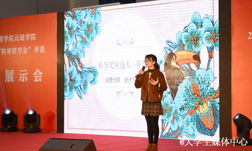 在现场展示会上,12位候选人通过ppt演讲、视频播放、才艺展示等形式向大家展示了他们不一样的大学生活。入围选手有的娓娓道来,有的慷慨激昂,他们有总结、有反思、有展望,“学霸”是他们的共同特点,但在通往“学霸”的道路上,他们又各自有着属于自己的精彩和感悟。他们鲜活的事例、精彩的演讲,迎来了观众的阵阵掌声,同学们纷纷表示除了震撼之外,更是受到了激励,希望能通过自己的努力,在不远的将来也能像这12位同学一样,走上特等奖学金的展示舞台。
