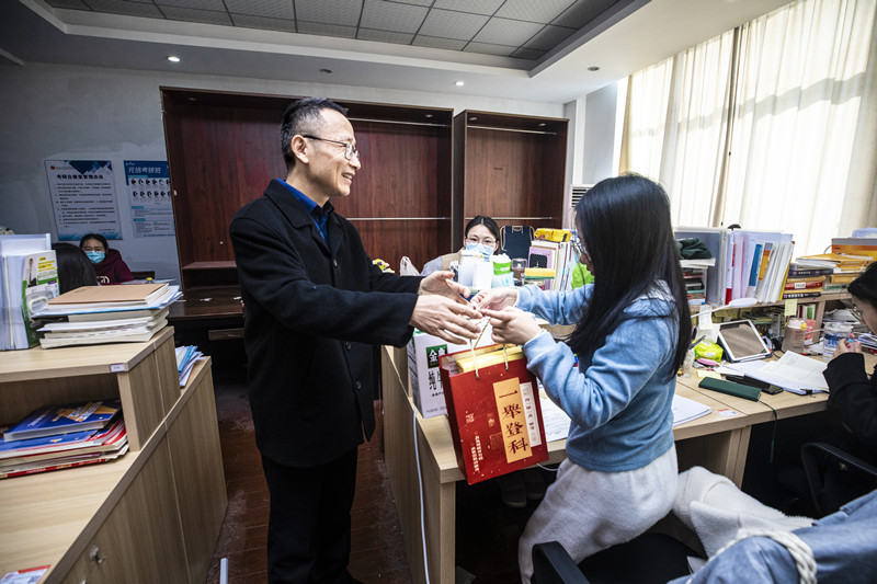 来到分院自习室,院领导们与考研学生亲切交流,询问同学们的学习和生活情况,了解大家在复习备考中遇到的困难,对同学们刻苦努力、积极进取的学习风貌表示充分肯定,并送上学院精心准备的“考研加油包”,叮嘱大家在备考最后阶段,既要按照计划持之以恒地学习,也要保持良好的心态,在享受考研学习的过程中不负青春韶华,成就人生理想。“考研加油包”外包装印有“一举登科”等字样,内有祈福文具袋、定胜糕、纯牛奶等含有吉祥寓意的物品,饱含学院对考研学生的美好祝福。
