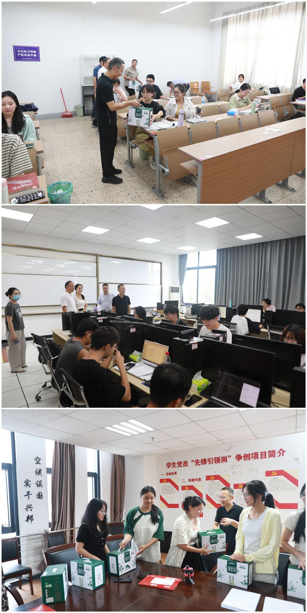 7月27日下午,学院院长沈红卫、党委副书记石旭明及相关职能部门负责人一行走访慰问暑期留校学生,先后亲切看望考研复习、竞赛集训和协助招生工作的学生,为他们送上慰问品。