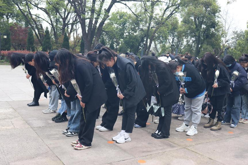 在革命烈士纪念碑前,全体师生庄严肃穆,默哀三分钟,有序敬献白菊并鞠躬;面向党旗,高举右拳,再次庄重地作出自己对党的庄严承诺;离开前,大家自发进行陵园周边志愿清扫,用行动表达对英烈的思念与缅怀之情。