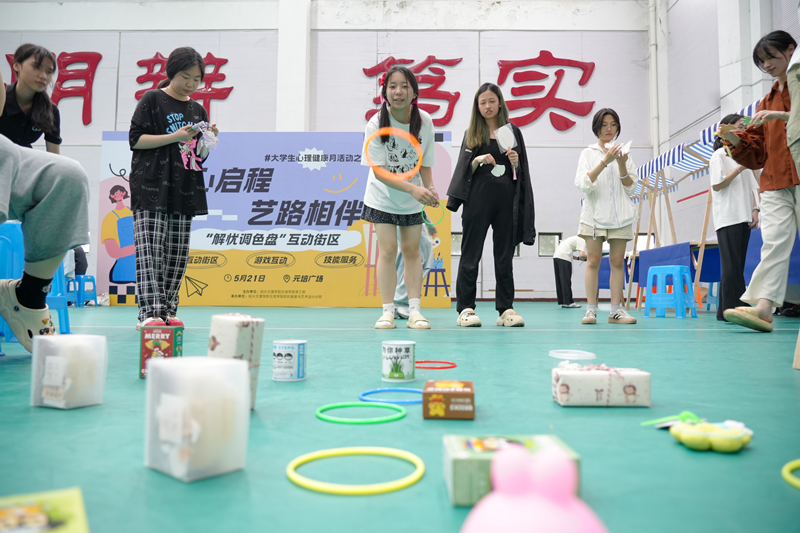 活动以艺术、运动、创意和沉浸式体验等形式展开,提供系列丰富的心理调适途径。在“艺心启程·艺路相伴”互动街区,同学们参与即兴绘画、手工创作、趣味游园等活动,借助艺术疗愈心灵,探寻爱的力量;“五育润心,沐光同行”心理趣味运动会将运动与心理调适相结合,让同学们在欢声笑语中缓解压力;创意绘画与互动艺术体验环节以画笔和色彩为纽带,引导同学们绘出心声;手作工坊带领同学们亲手制作风铃,在游戏中学习知识,感受温暖与欢乐。